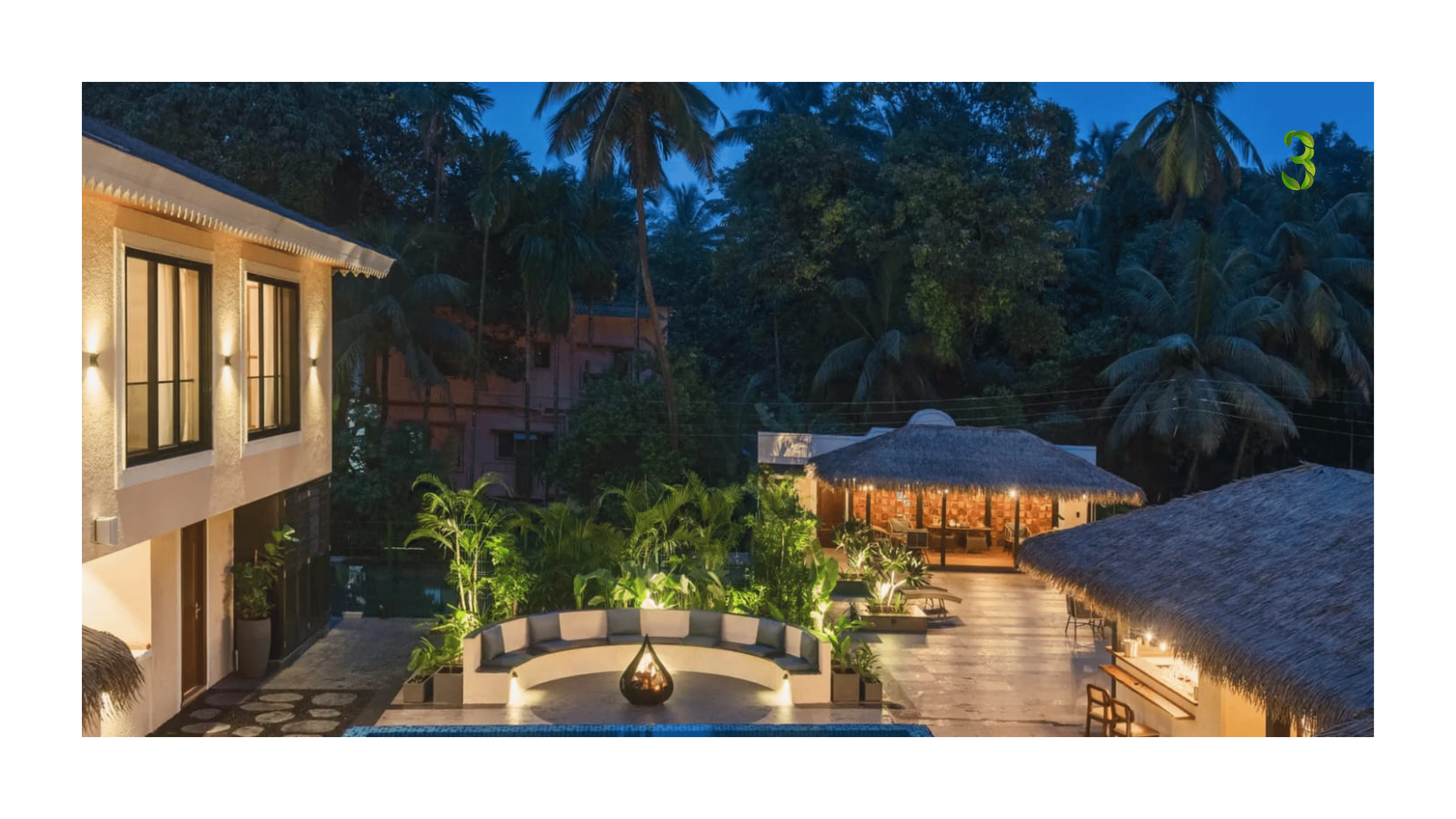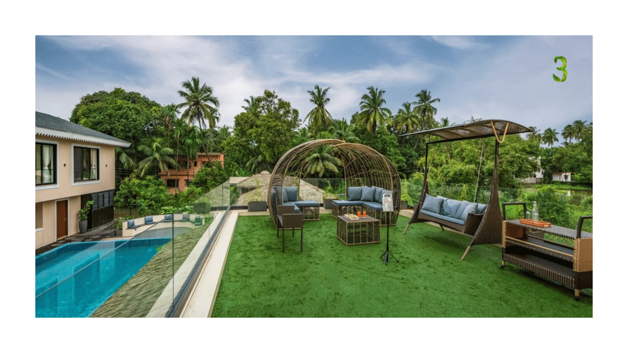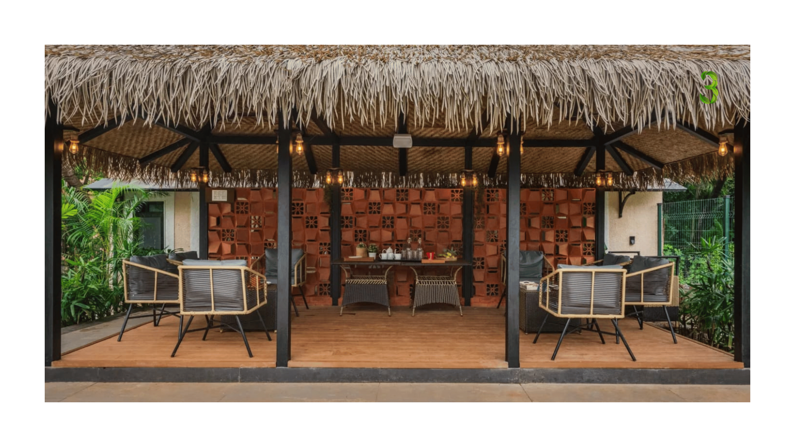 The space features a perfect blend of lush lawns and hardscape, complemented by a cozy fire-place, pergola, BBQ, and dedicated seating zones. Landscaped parking and a welcoming main entrance add functionality, while vines and greenery provide privacy and natural charm – where your bungalow truly meets luxury and nature