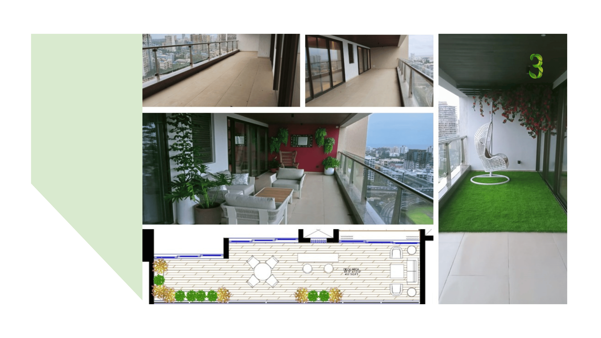 For Mr. Shailesh Kapoor’s residence in Andheri West, the space was designed with potted plants and minimal furniture to create a cozy corner for unwinding after work and reconnecting with nature. Thoughtful landscaping turns small open spaces into serene escapes.